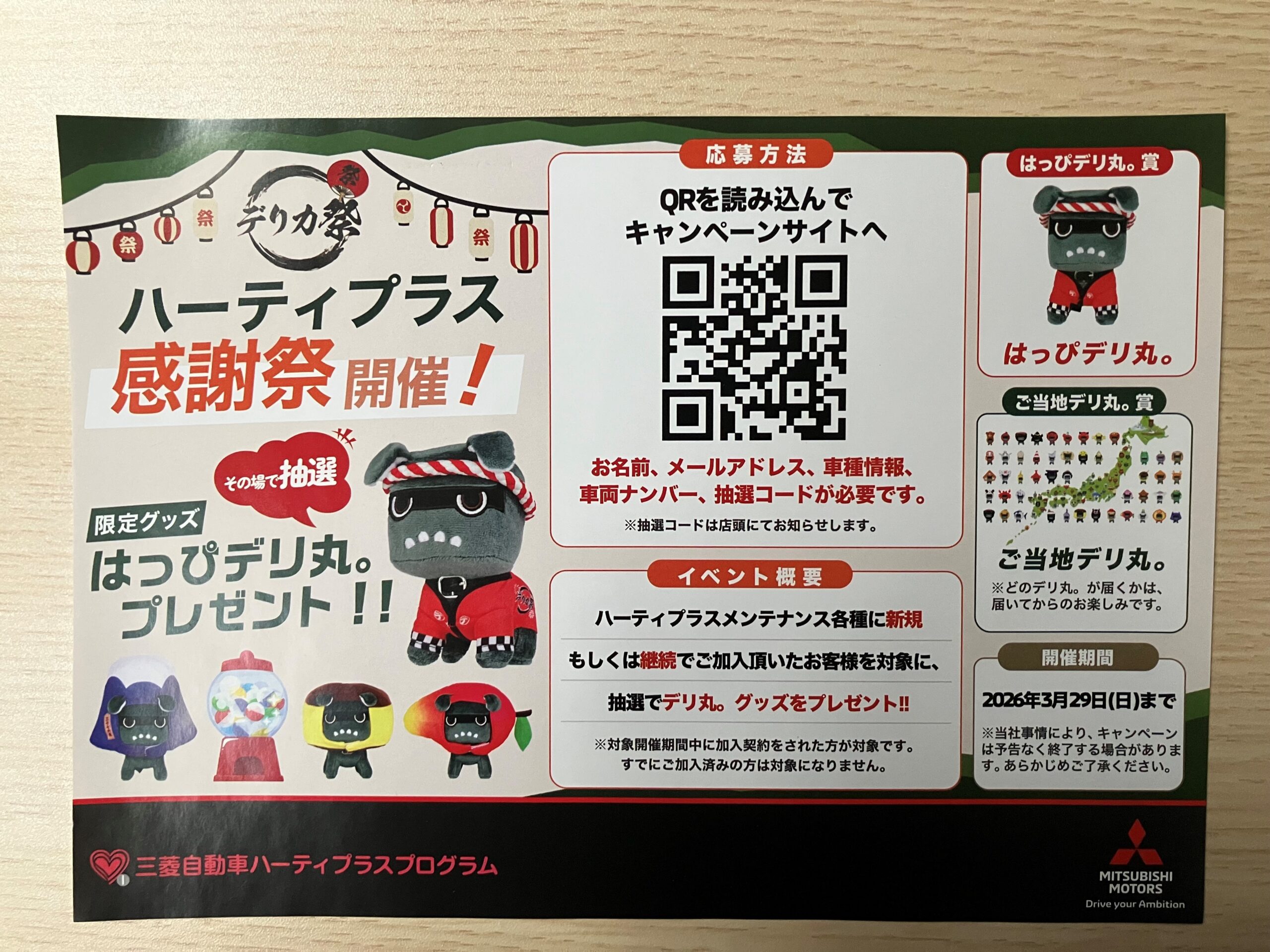 ハーティプラスメンテナンスに新規もしくは継続でご加入いただいたお客様対象に、抽選でデリ丸。グッズを