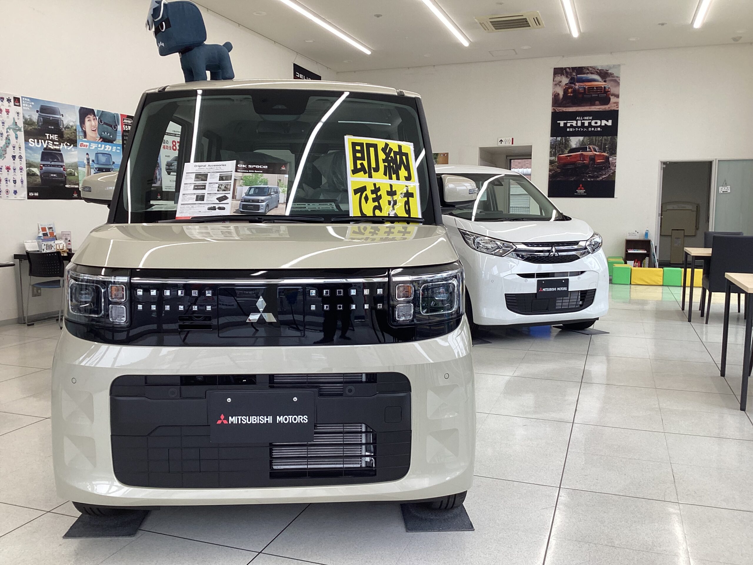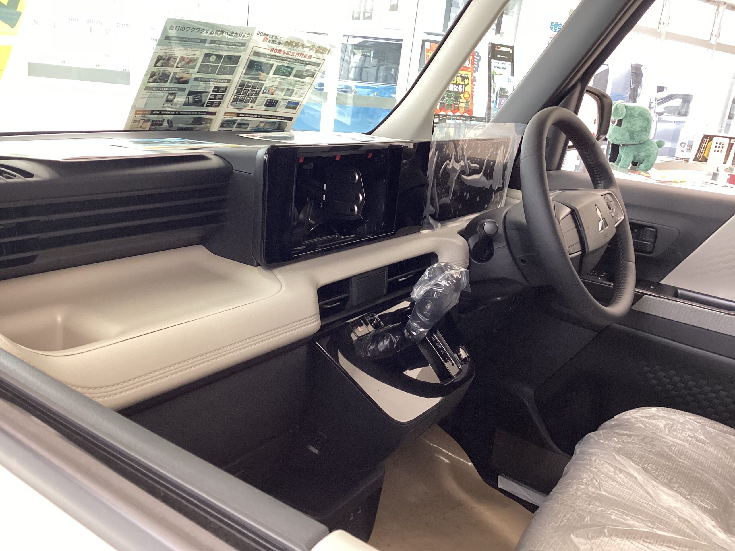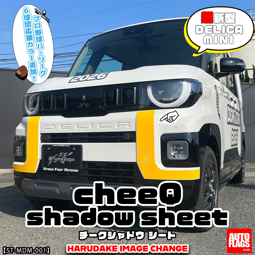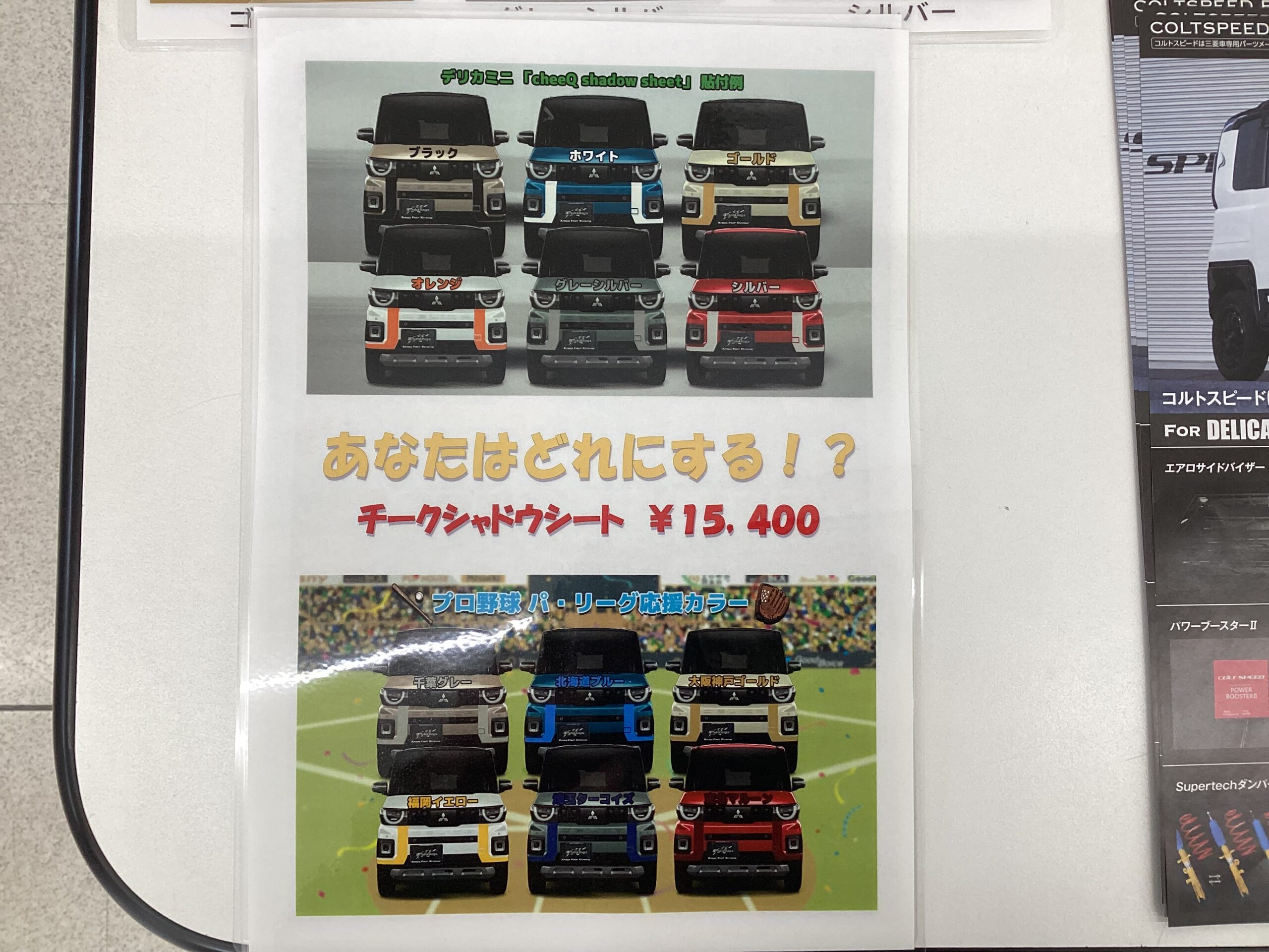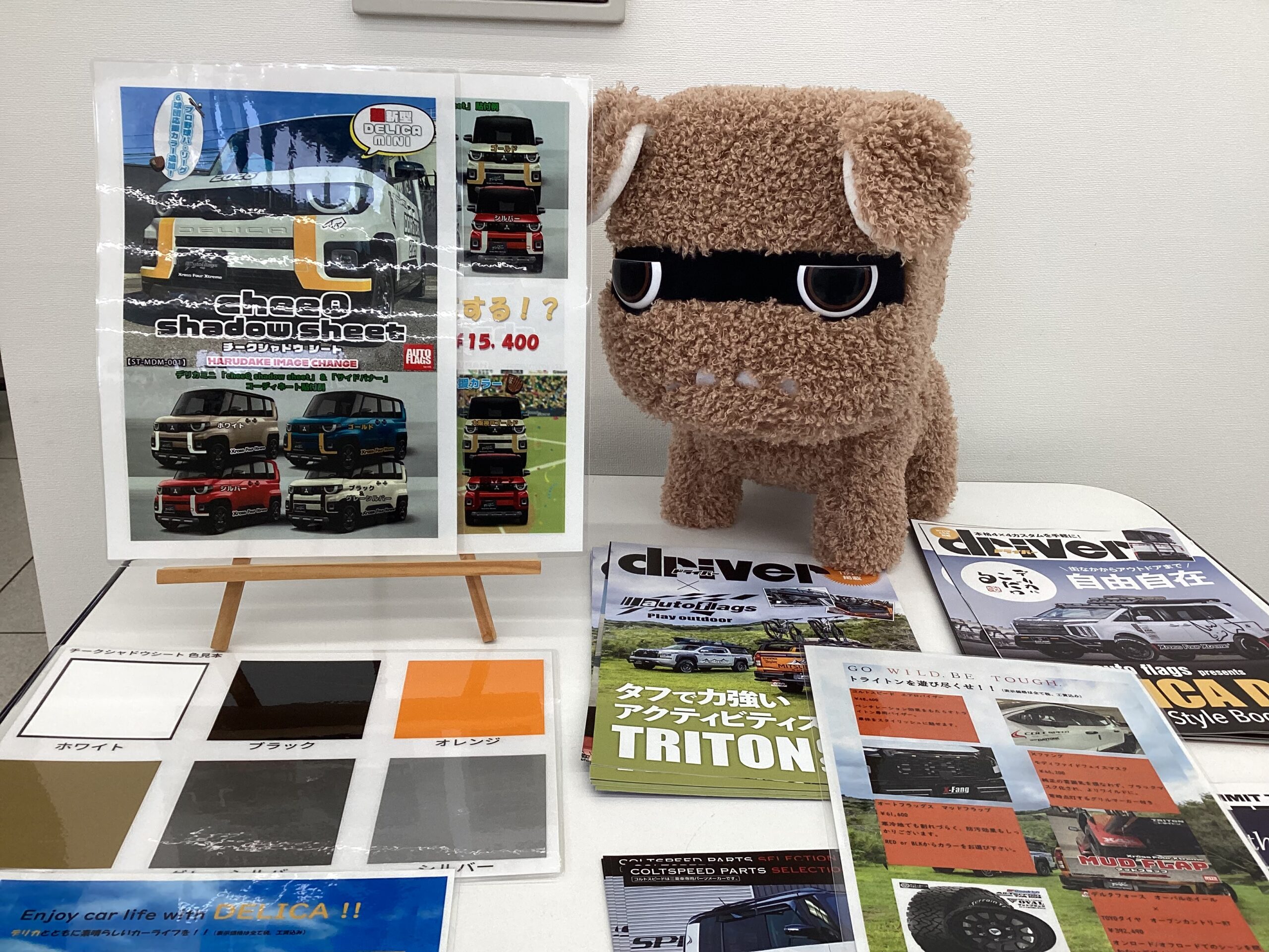 また、店内にオートフラッグス様の新製品「超新型デリカミニ専用チークシャドウシート」のチラシ、色見本を掲示中です。