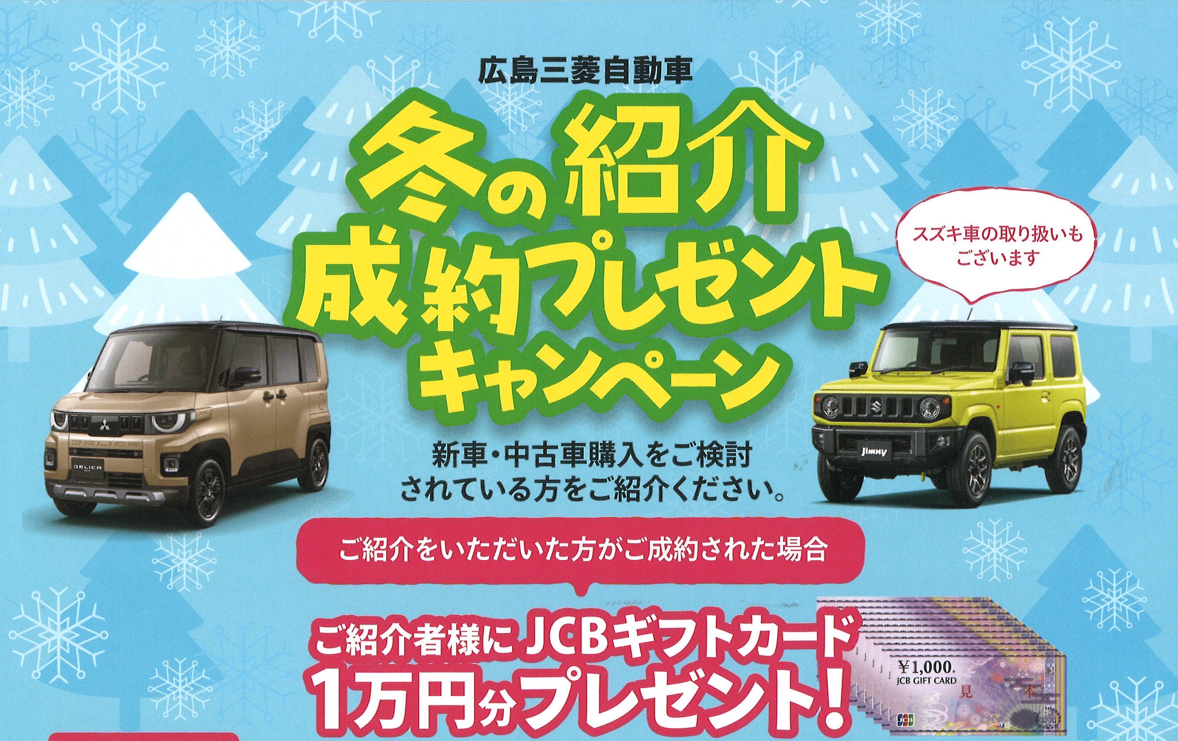 広島三菱自動車販売では、当社をご利用いただいているお客様が新規のお客様・他社からのお乗り換えのお客様をご紹介いただき、 新車・